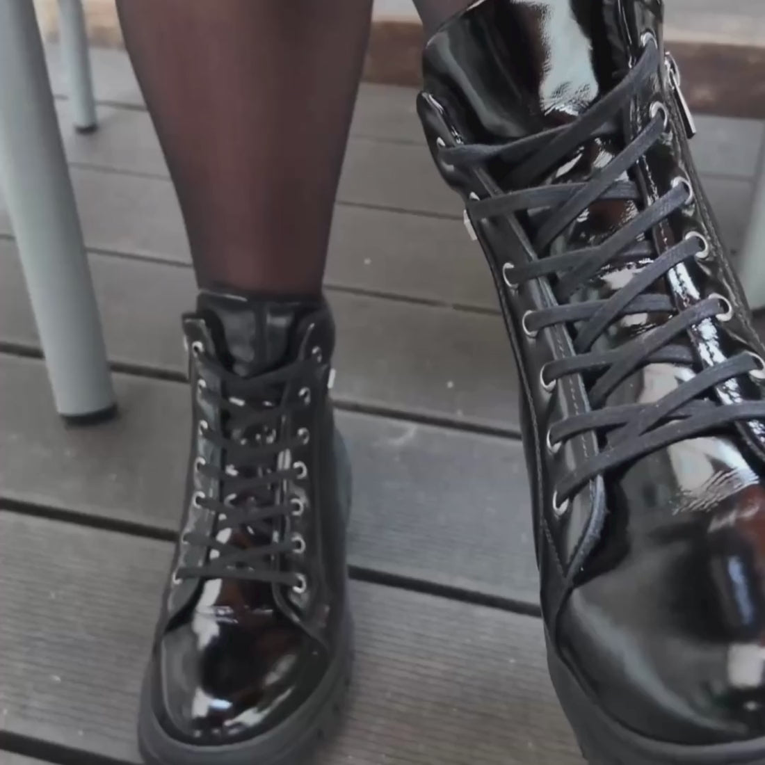 Knöchelhohe Stiefeletten mit Innenfutter aus Fell in glänzendem Leder, ergänzt durch ein metallisches Logo.